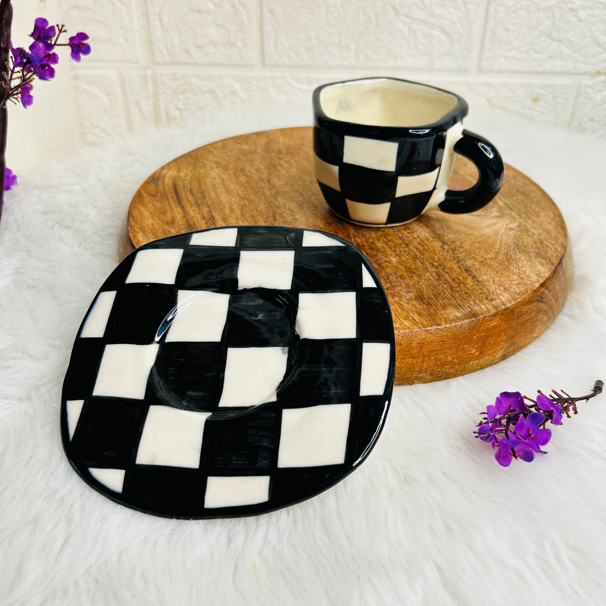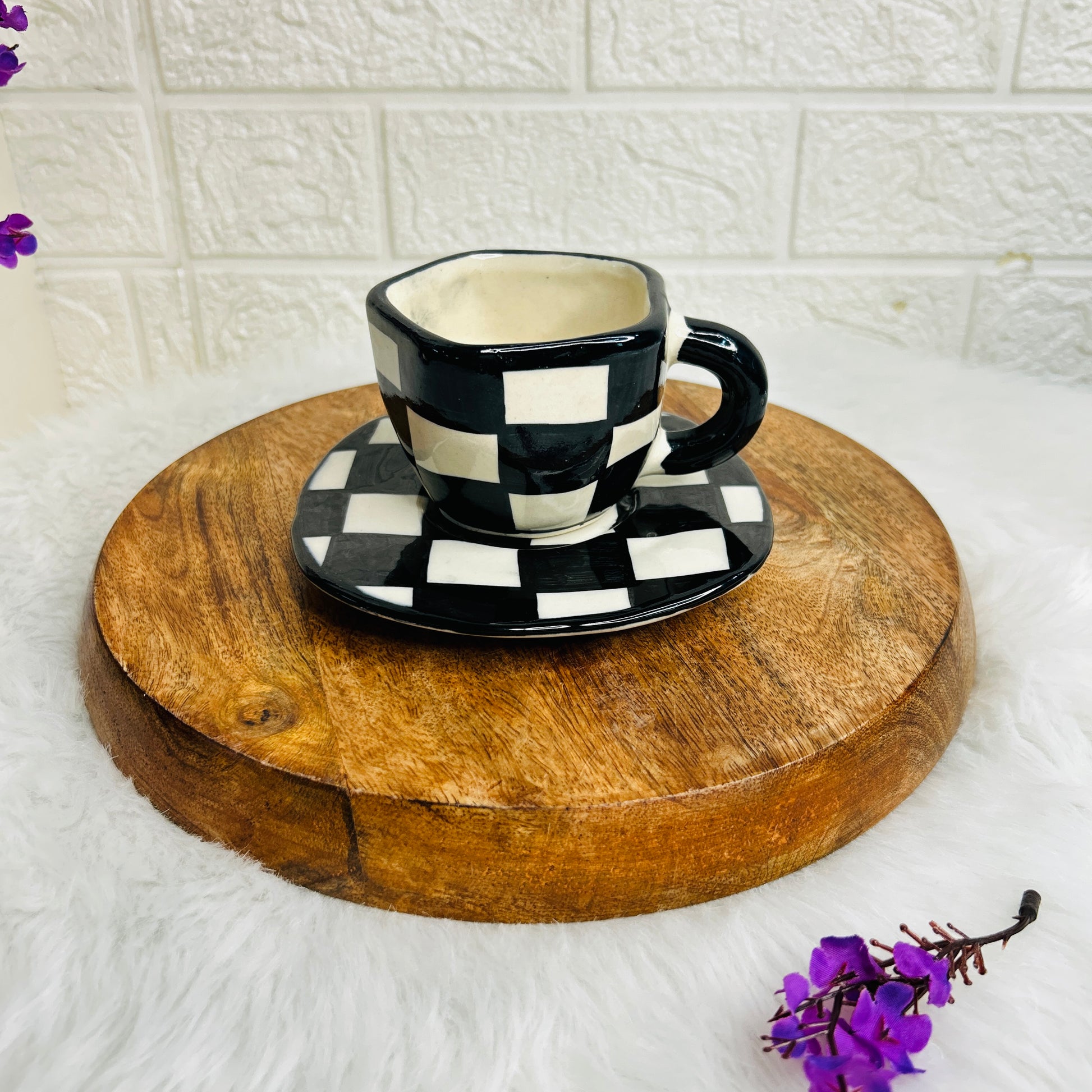 Bold and timeless, our black checks cup and saucer set is where classic design meets artisan charm. Handcrafted with care, this ceramic cup and saucer features a striking checkered pattern in black and white, making it a standout piece for your morning coffee or afternoon tea. Perfect for those who love modern ceramic drinkware with a touch of retro flair, this checkered ceramic set adds style to any table setting. Each piece is uniquely handmade, ensuring no two sets are exactly alike — just like your personal style. Whether you're elevating your own coffee ritual or gifting a friend who loves aesthetic pottery, this handmade checkered cup and saucer is a beautiful blend of function and art.