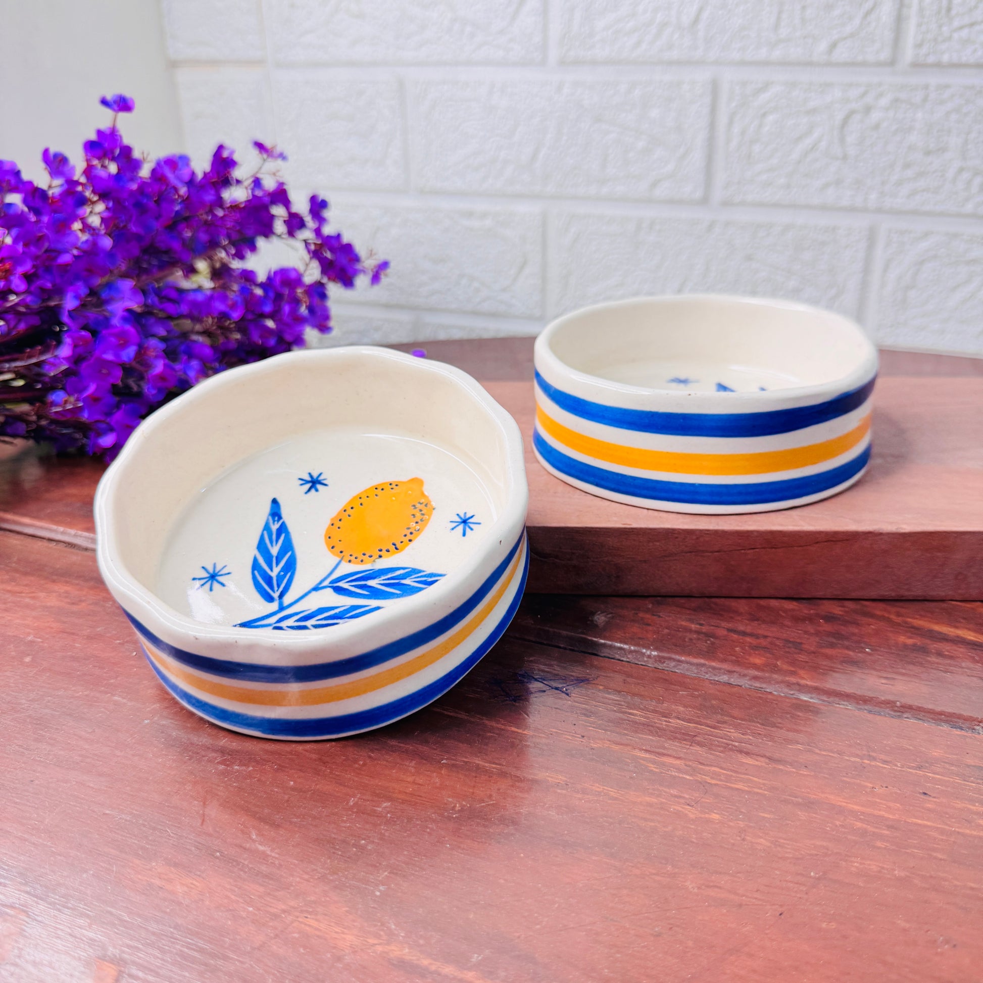 Brighten up your space with this handmade ceramic bowl featuring a vibrant lemon illustration and Mediterranean-style blue and yellow stripes. Each piece is thoughtfully hand-crafted, bringing a burst of sunshine and artisanal charm to your table.