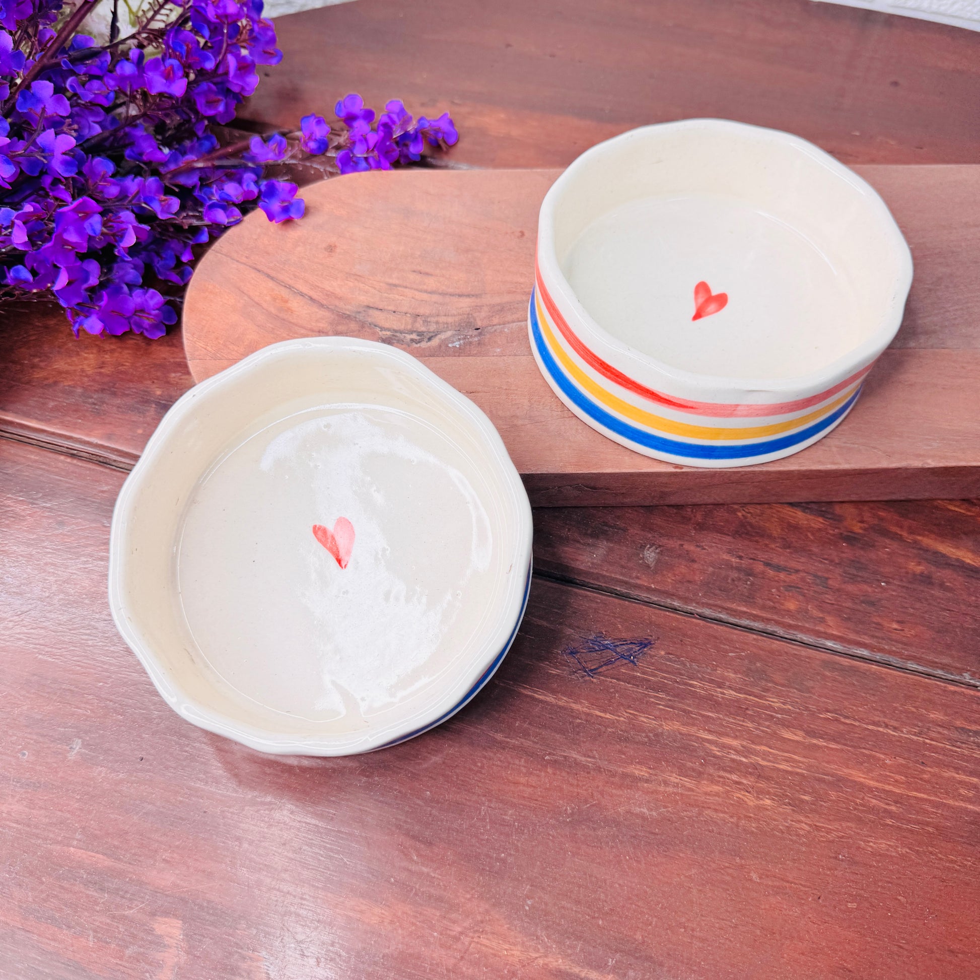 The heart detail adds a touch of love, while the red, yellow, orange, and blue stripes give it a fun and sunny vibe. Ideal for serving snacks, dips, desserts, or even as a small catchall dish for your favorite trinkets.