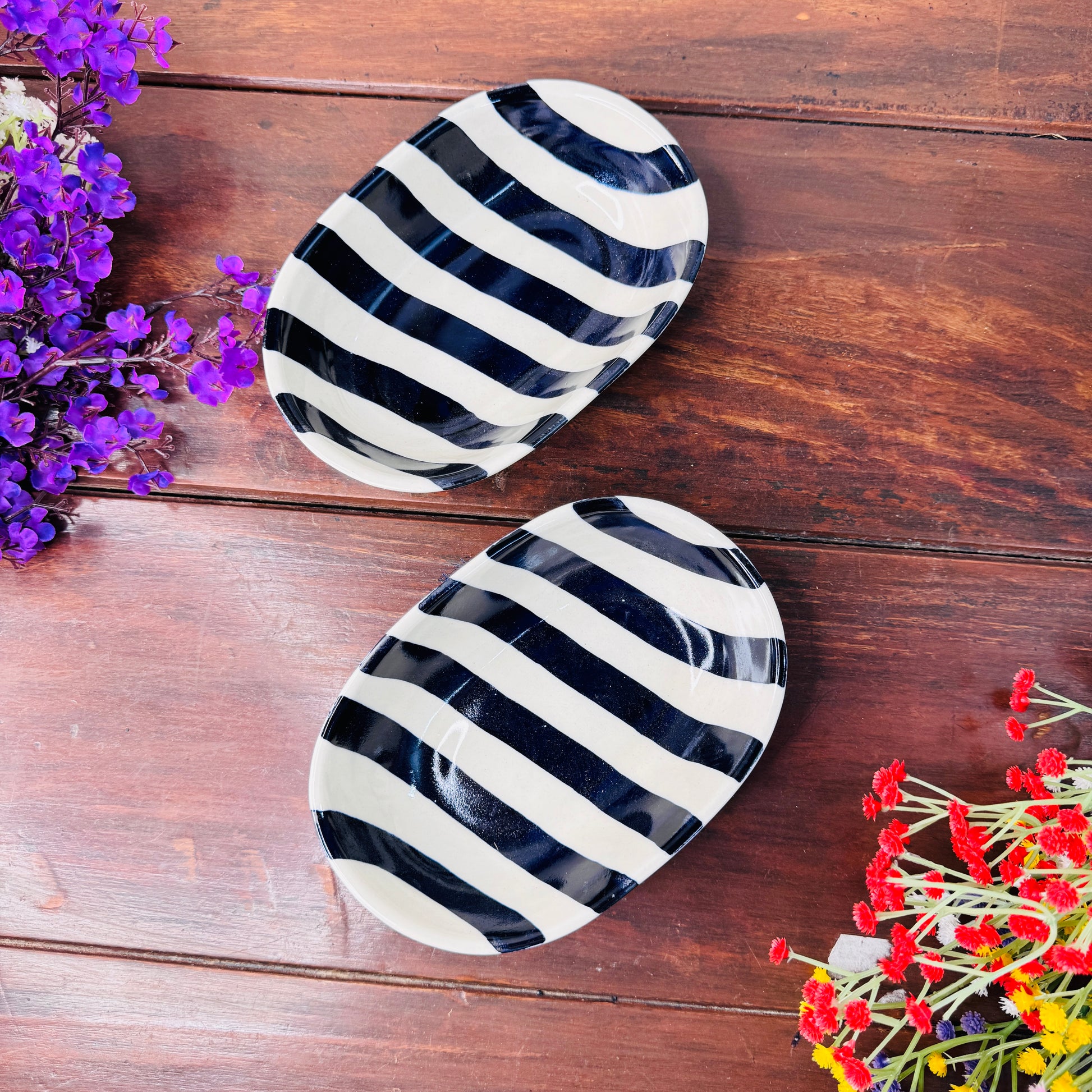 Make a bold statement on your dining table with our Handcrafted Black & White Striped Oval Ceramic Bowl. Designed with a contemporary black-and-white striped pattern inside and a smooth ivory base outside, this versatile bowl is perfect for both modern and minimalistic table settings.
