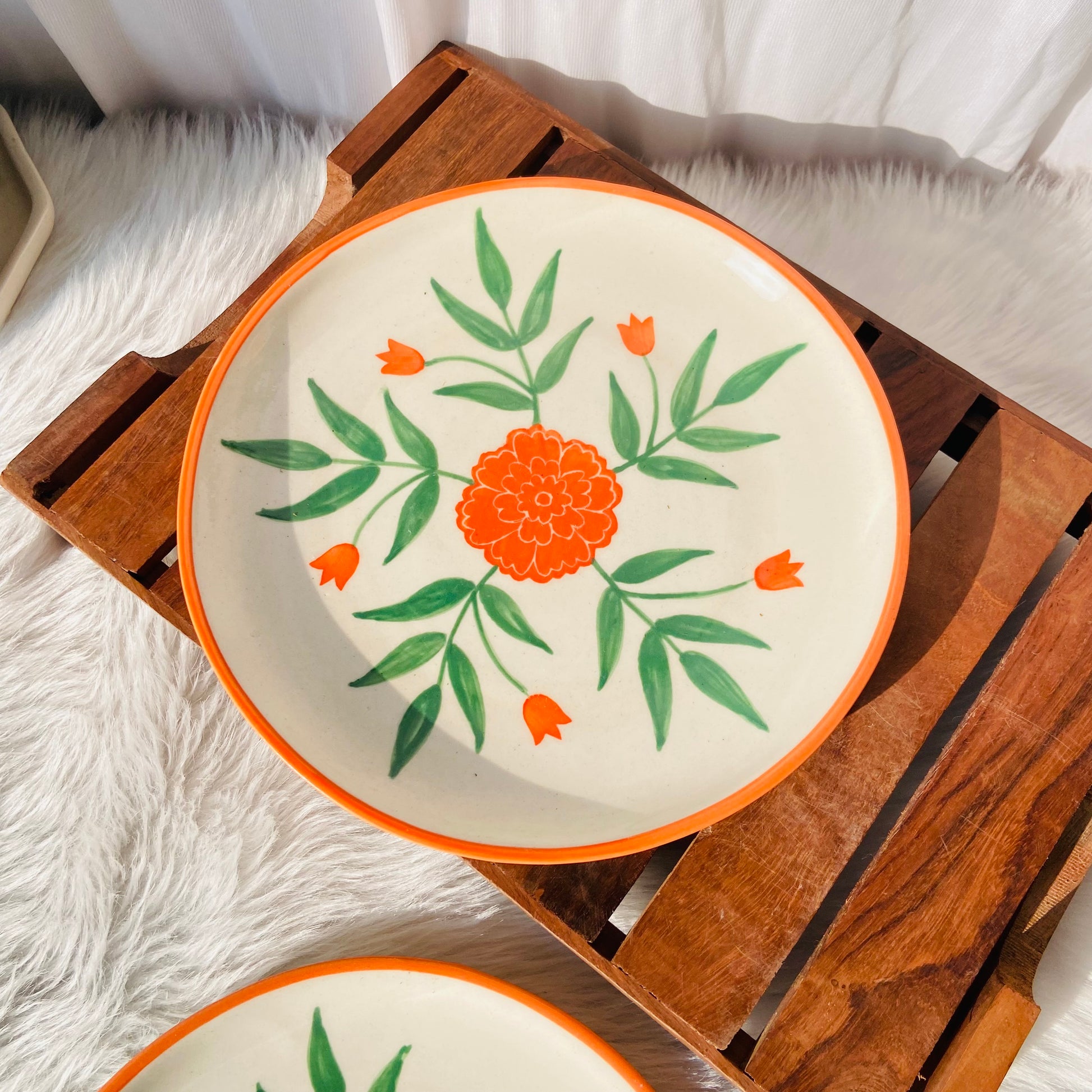 Each piece is hand-painted with a vibrant orange marigold surrounded by fresh green leaves, giving your table an uplifting, festive, and earthy charm.