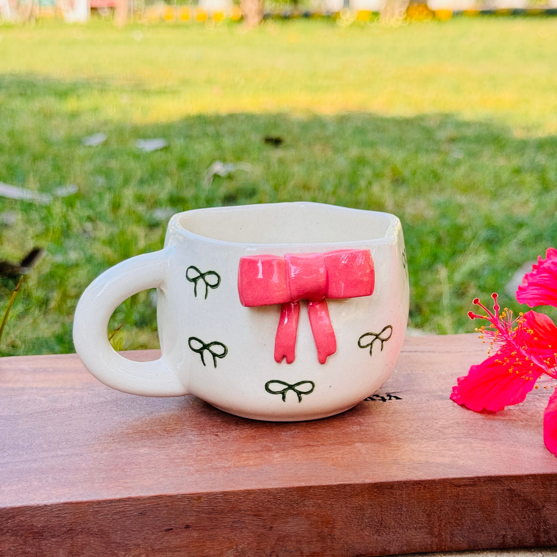 Sip in charming elegance with the Pinterest Bow Coffee Mug , a handcrafted ceramic coffee cup designed for those who love whimsical and aesthetic drinkware. Featuring a delicate 3D pink bow perched on mug and hand-painted dainty green bows sprinkled all over the mug , this cottage core-inspired ceramic mug adds a sweet touch to your tea time or coffee break. Its ergonomic handle ensures a comfortable grip, making it both functional and stylish. Perfect for latte lovers, tea enthusiasts, and hot chocolate indulgence, this handmade pottery mug is a cute gift for her, ideal for birthdays, holidays, or anyone who adores girly and vintage-style mugs.