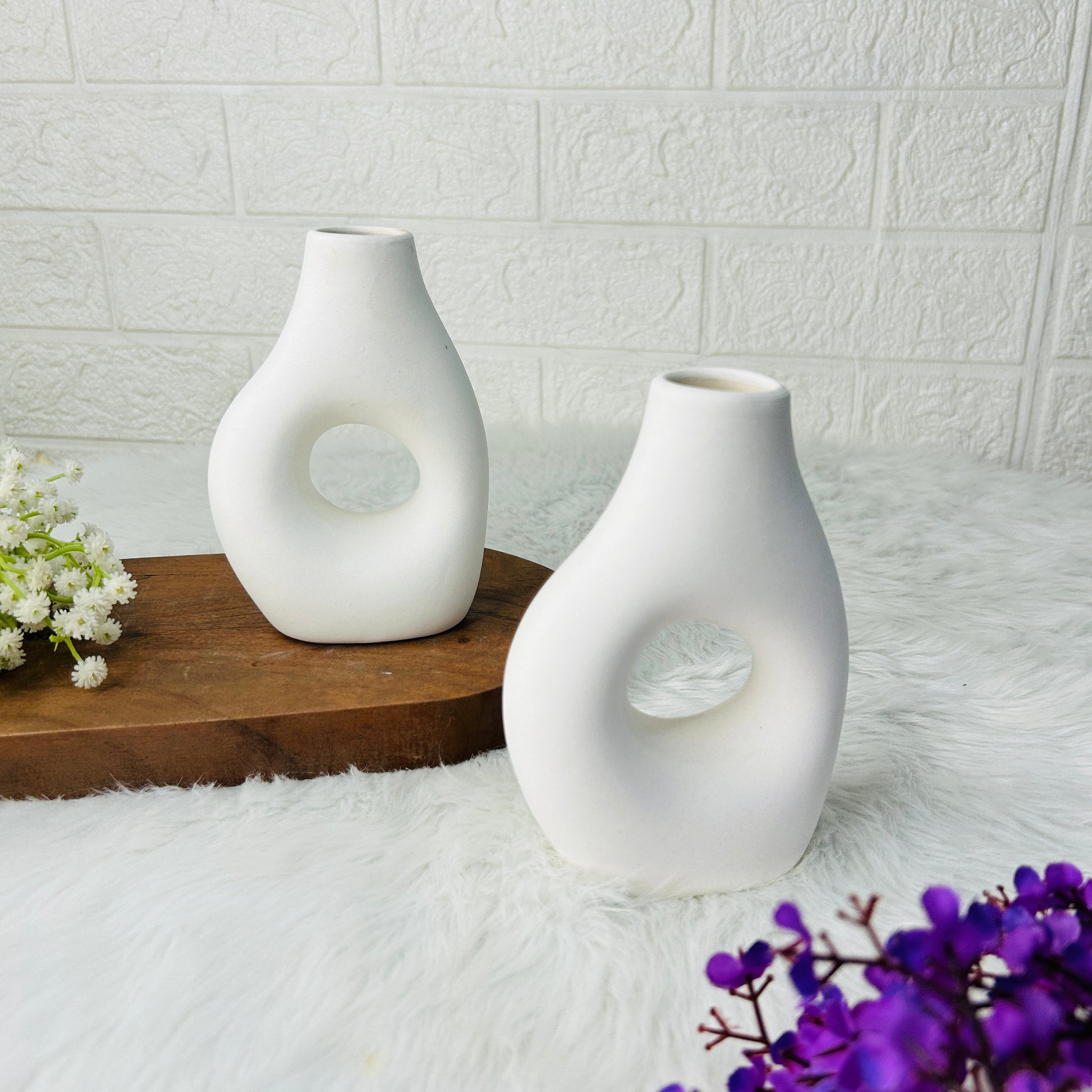 Add a touch of modern elegance to your space with the Ethereal White Ceramic Hollow Vase. Crafted from high-quality ceramic, this vase features a sleek matte finish with a unique hollow center design that embodies minimalism and sophistication. Perfect for displaying fresh flowers, dried arrangements, or simply as a standalone décor piece, its contemporary aesthetic complements both modern and classic interiors. Place it on your dining table, console, or side shelf to instantly uplift the ambiance of your home.